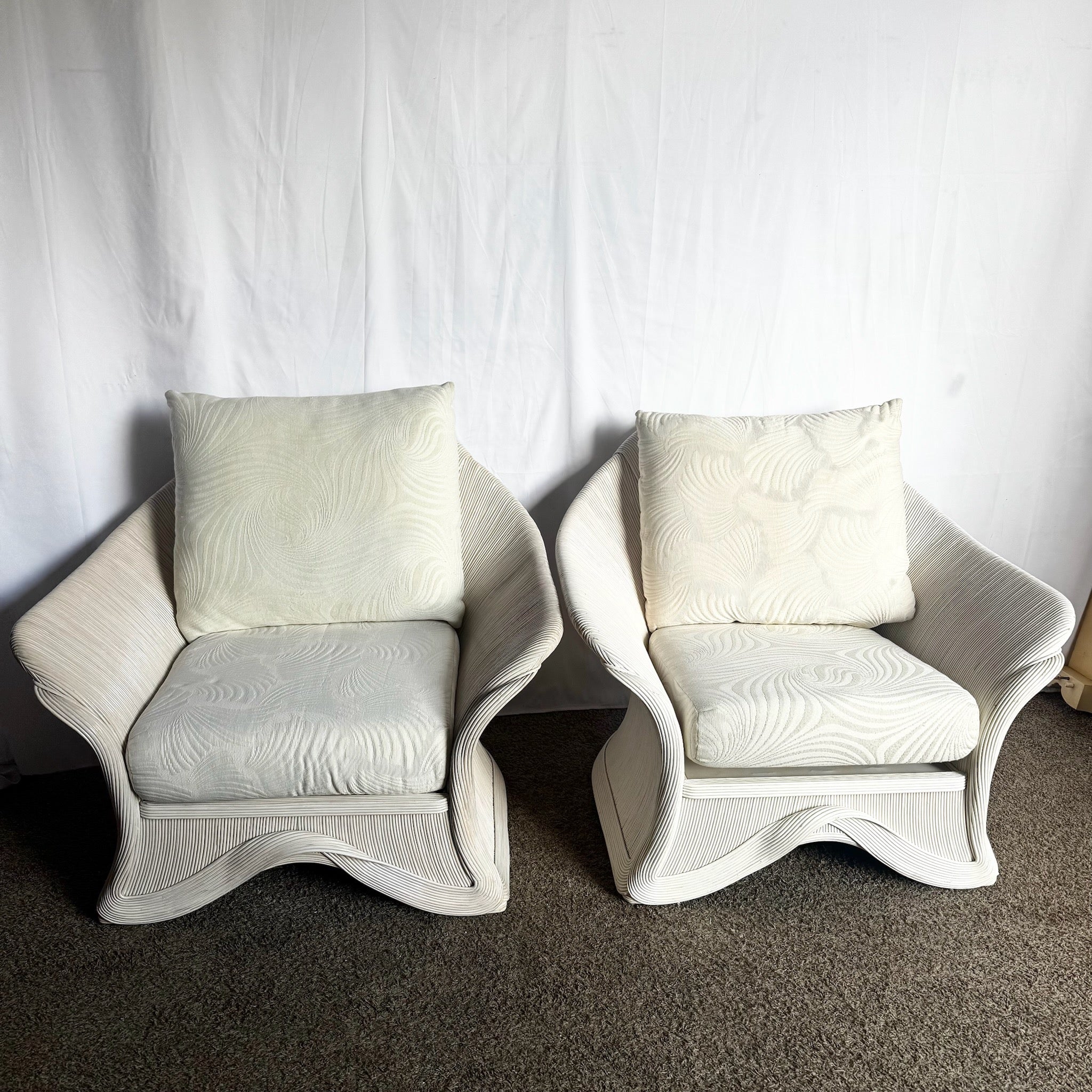 Postmodern Boho Sculpted Pencil Reed Lounge Chairs - A Pair
