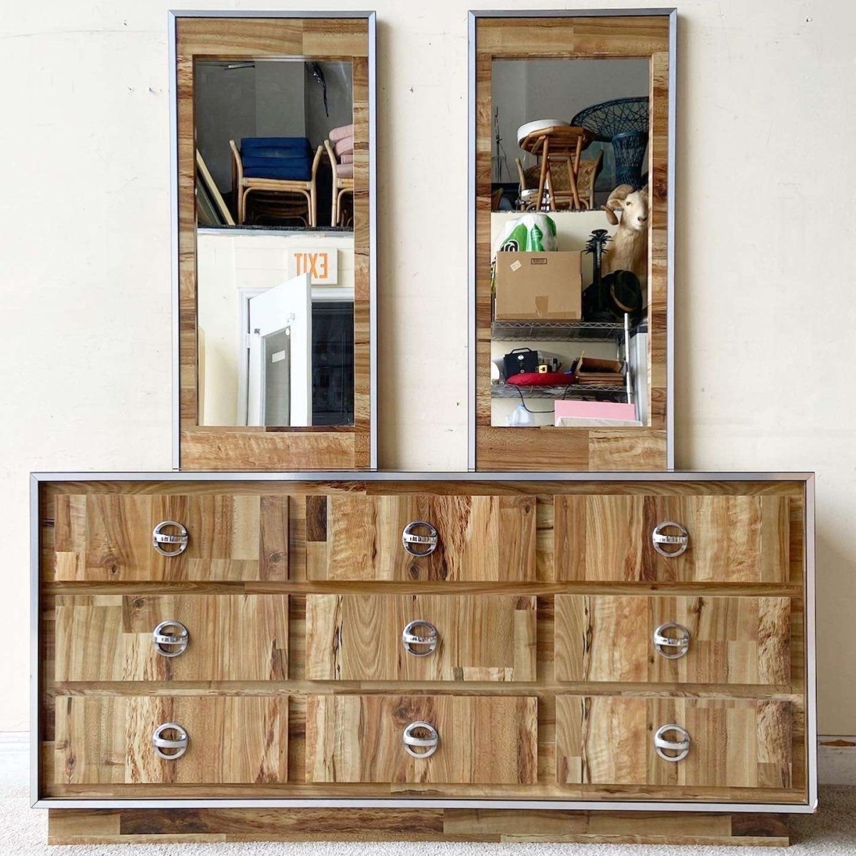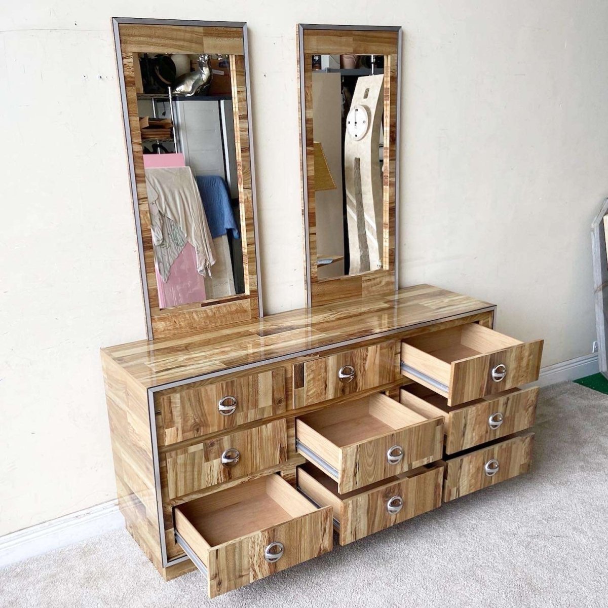 Postmodern Woodgrain Laminate Dresser With Mirrors - 3 Pieces