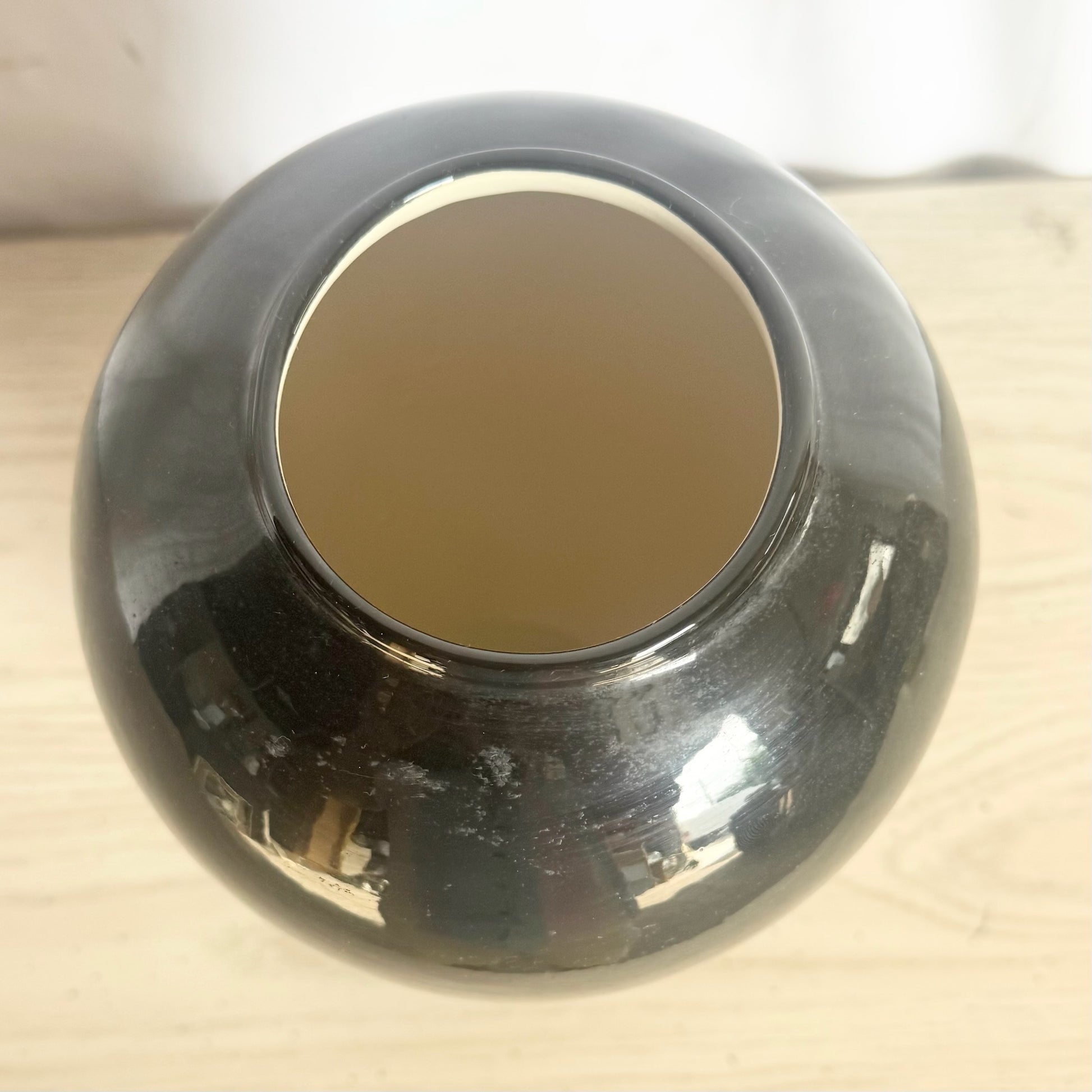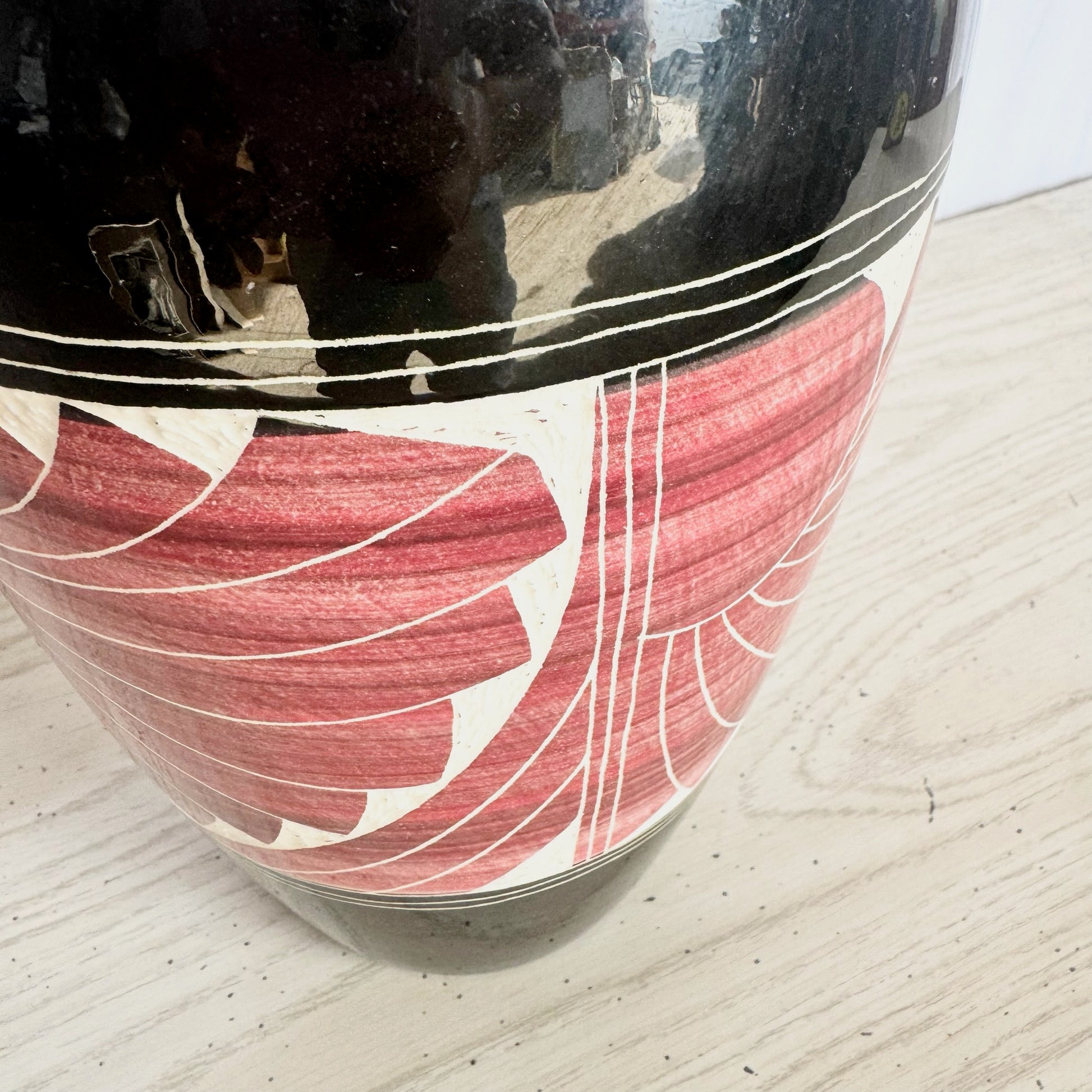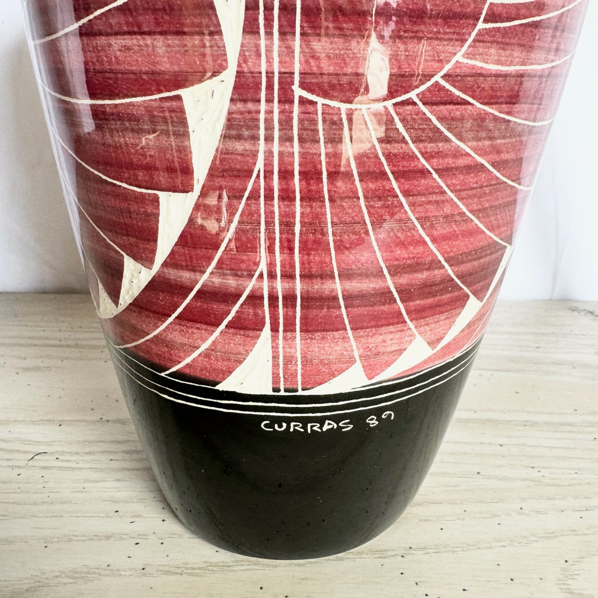 This 1989 Sgraffito Pottery Vase Curras delivers bold graphic contrast and artisan texture, finished in striking black, white, and red.