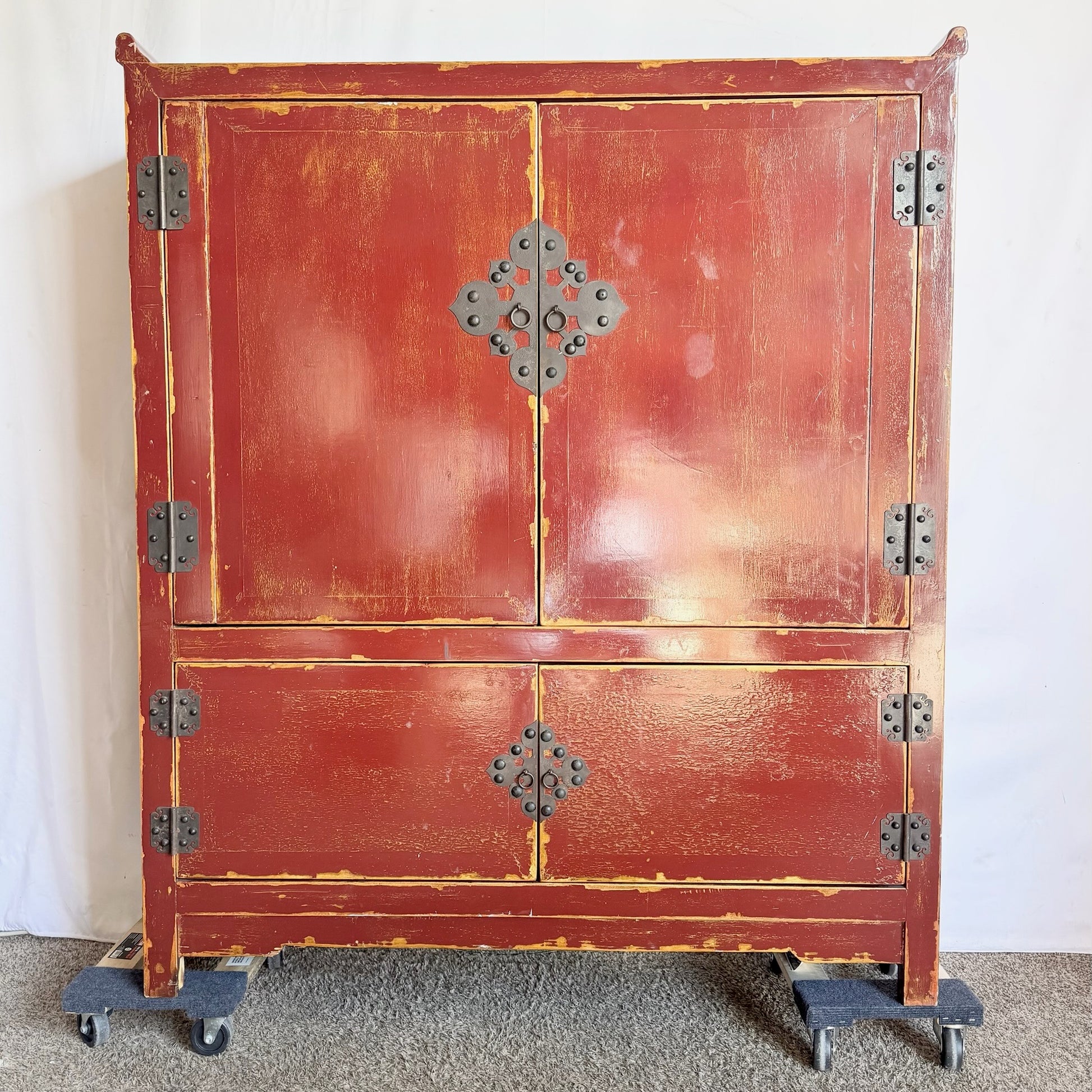 This Chinese Red Gold Distress Finish Armoire brings dramatic color, ornate detail and timeless craftsmanship into elevated interiors.