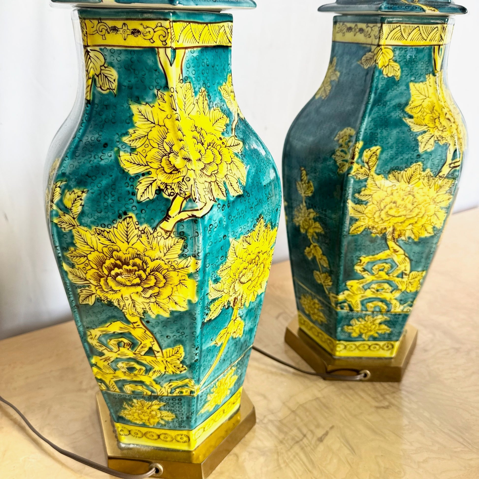 This pair of Chinoiserie Blue Yellow Porcelain Lamps blends classic porcelain artistry with vibrant glaze and refined presence.
