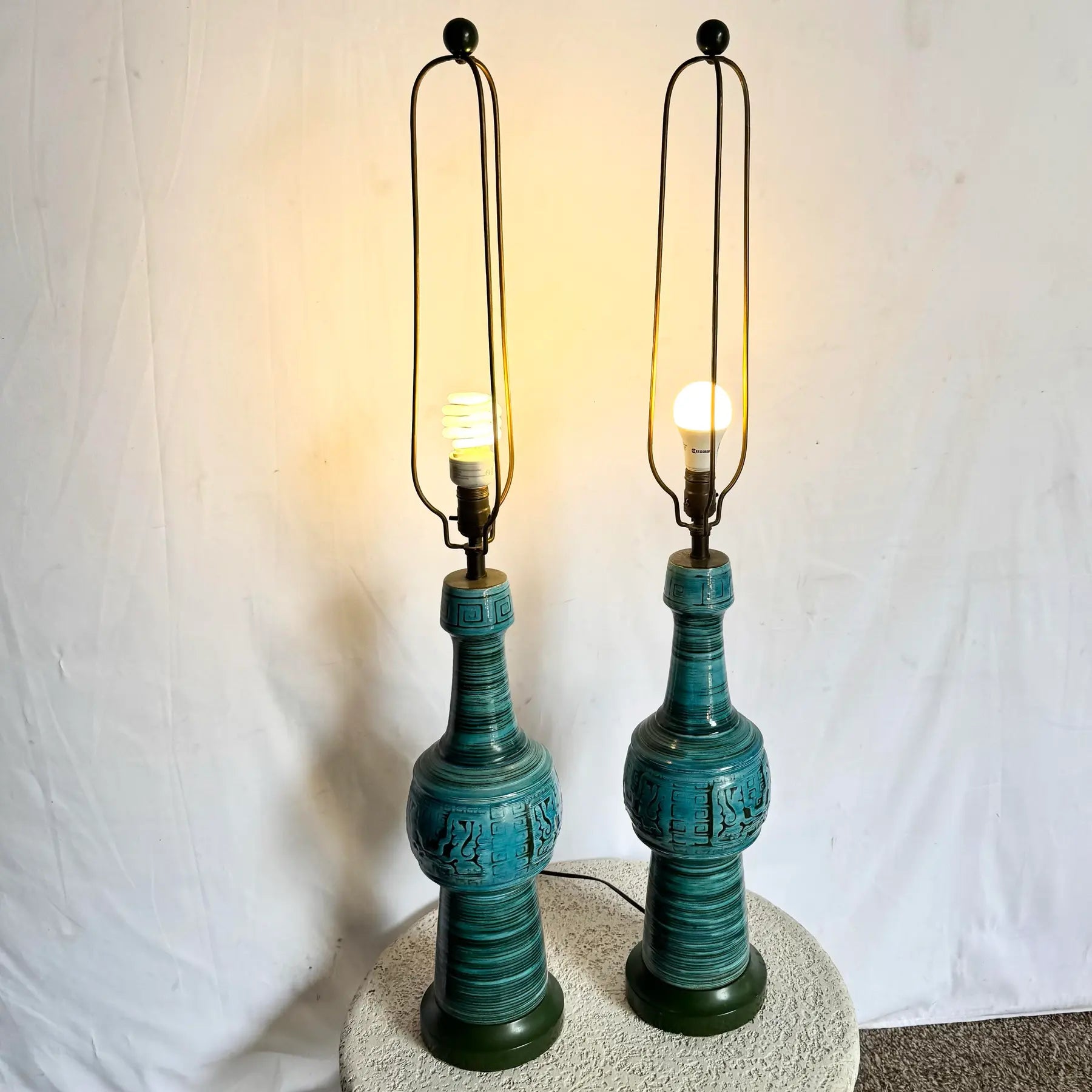 - The Chinoiserie Turquoise Blue Ceramic Lamps feature temple-inspired silhouettes with detailed embossed patterns.