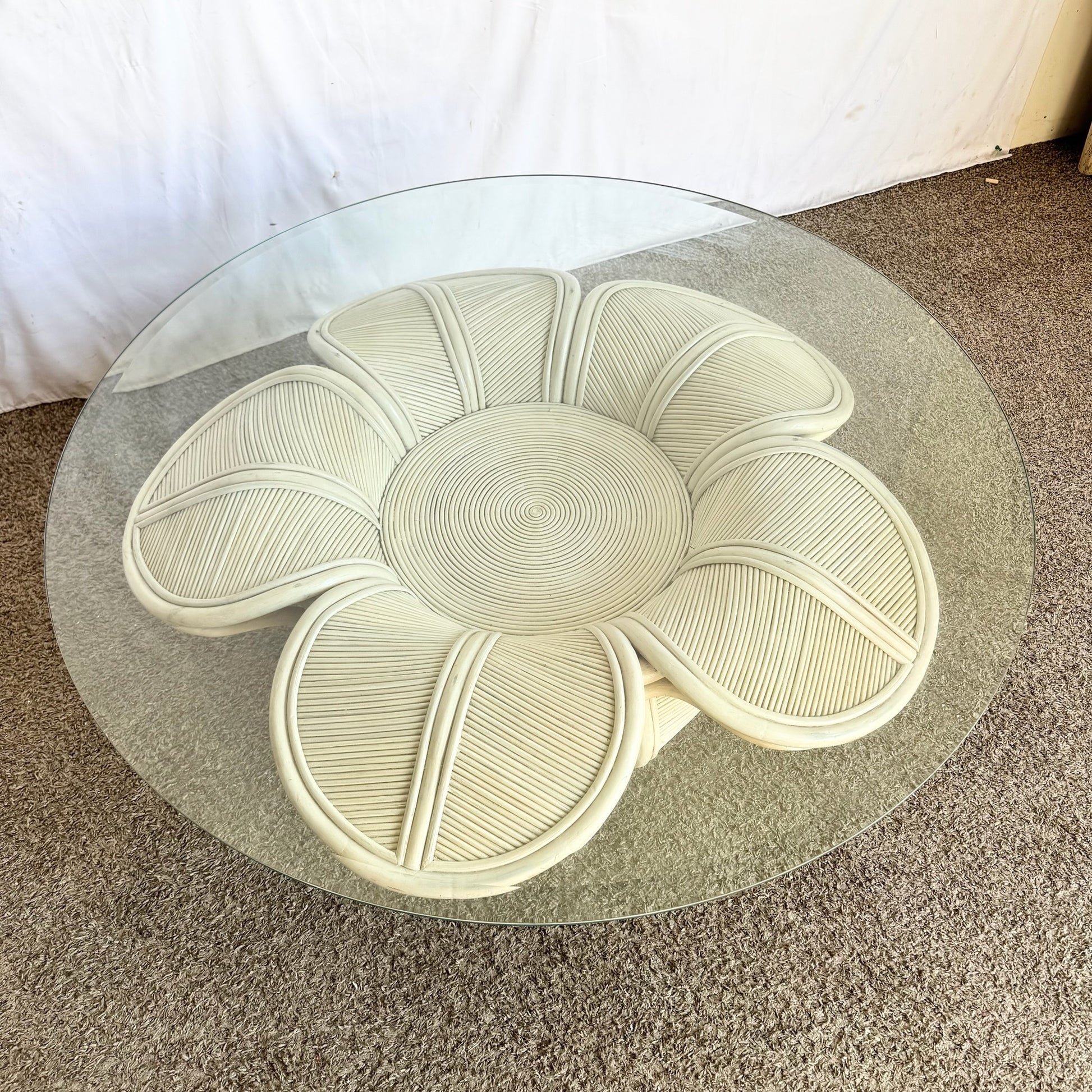 - The Coastal Bellflower Rattan Glass Table features a bellflower-inspired reed and rattan base topped with clear glass, balancing artisanal woven detail and modern clarity.