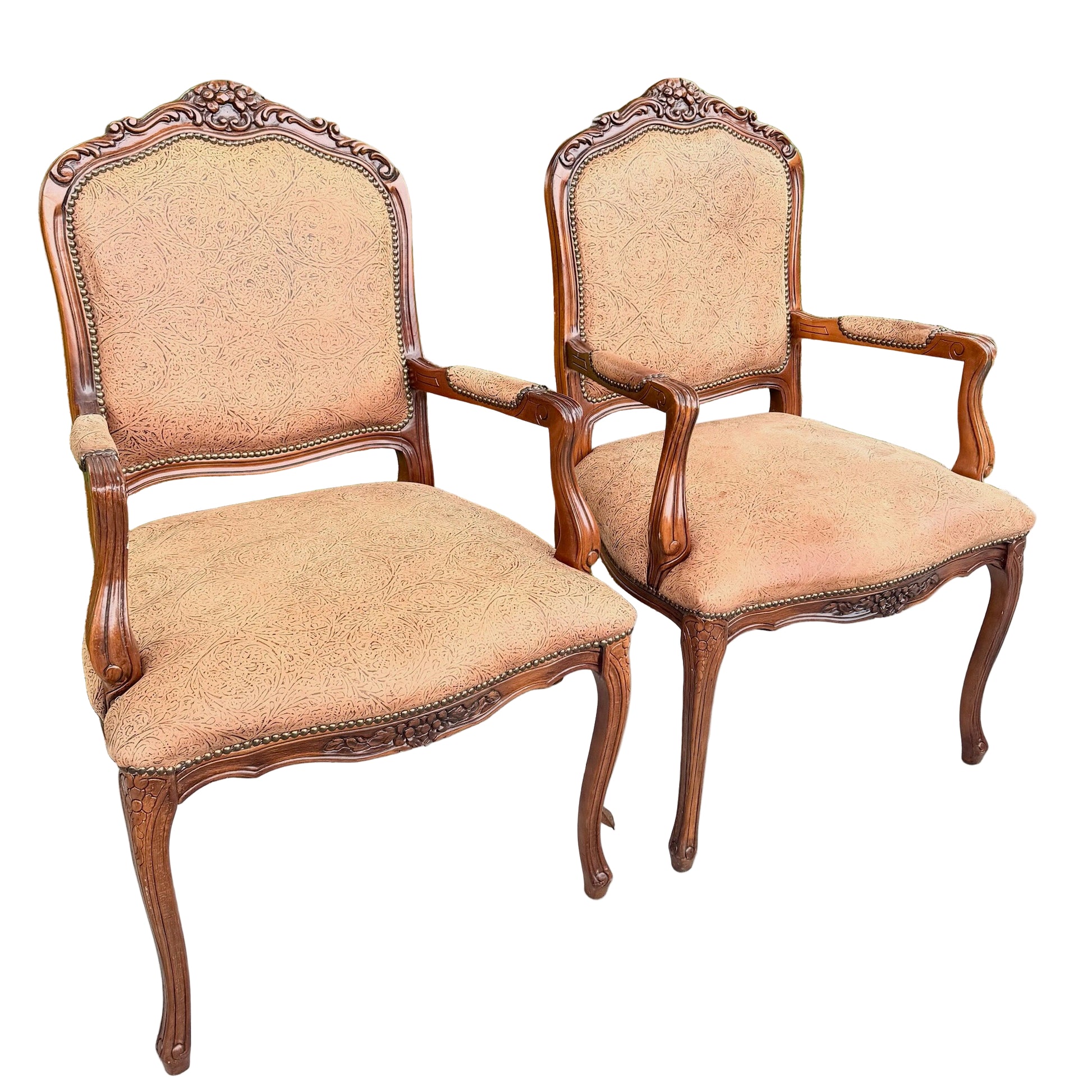 These French Provincial Brown Vinyl Chairs blend richly carved wood frames with durable, luxury-grade vinyl upholstery and decorative nailhead trim.