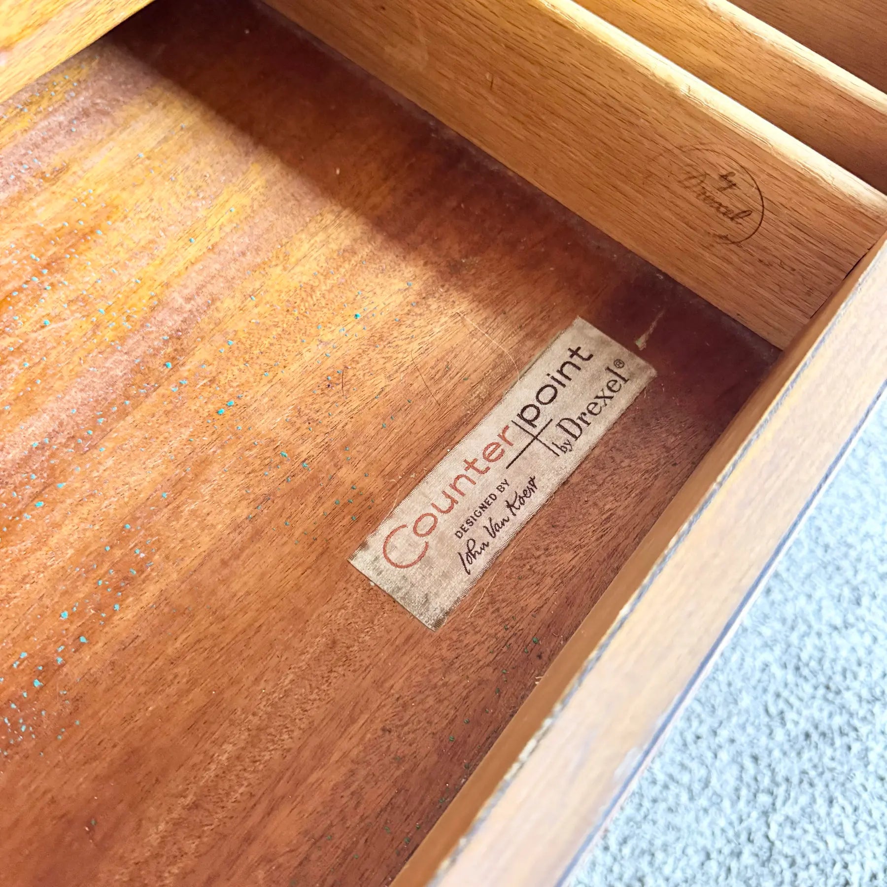 This Mid Century Counterpoint Credenza Hutch by Drexel pairs architectural lines with warm wood tones, creating an elegant and functional focal point.