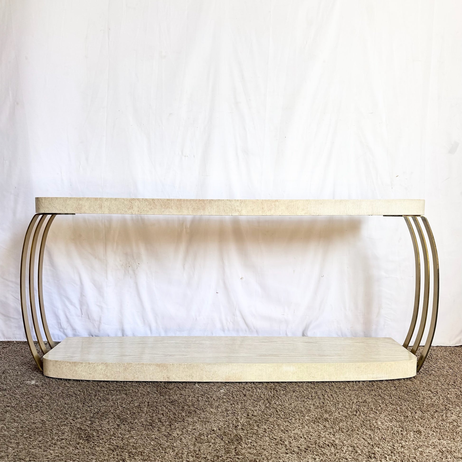 This Henredon Brushed Brass Cerused Oak Console pairs sculptural brass curves with a cerused oak finish for a refined, architectural statement.
