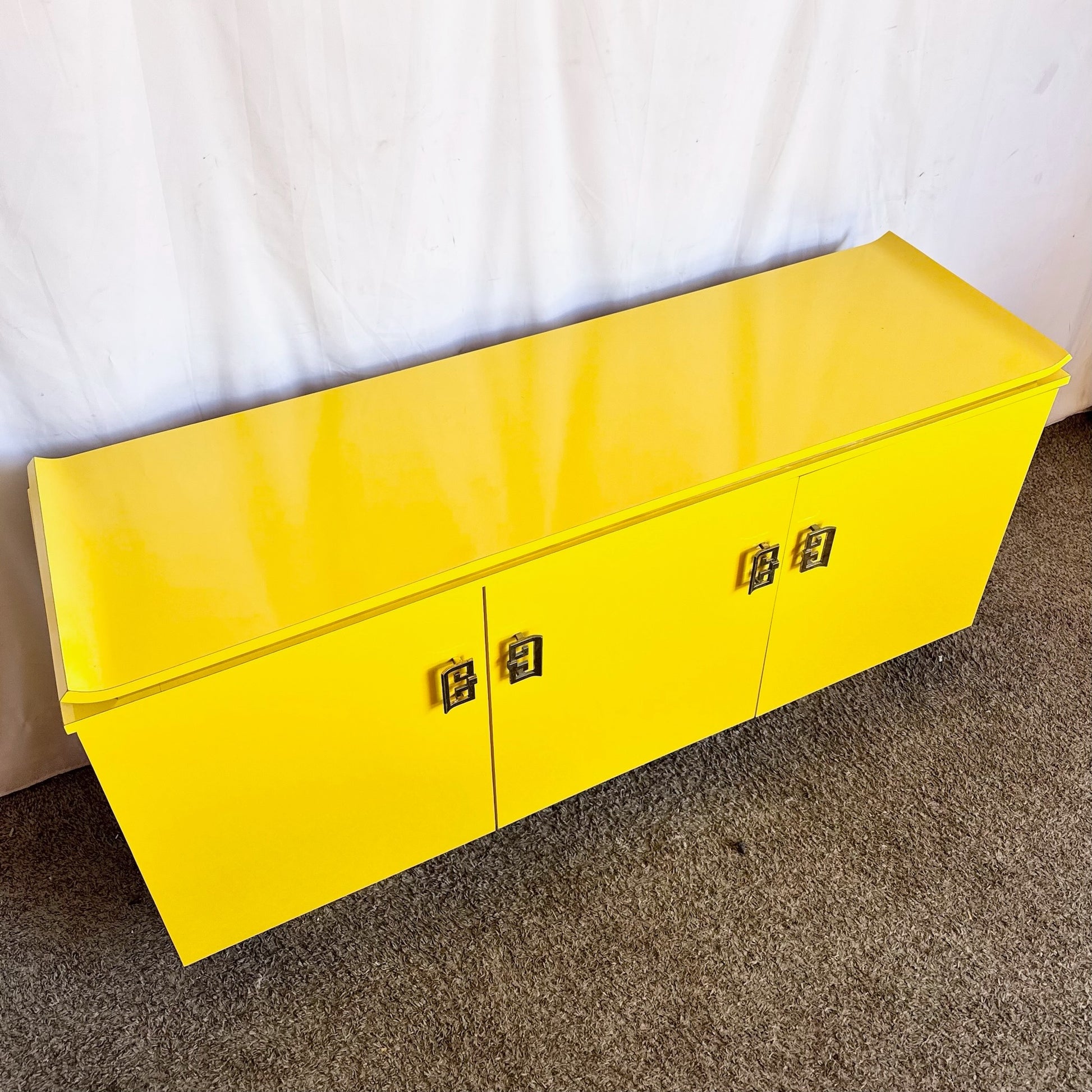 - The Postmodern Chinoiserie Yellow Lacquer Credenza features a vibrant yellow lacquer-laminate finish accented with chinoiserie-inspired detail for striking impact.
