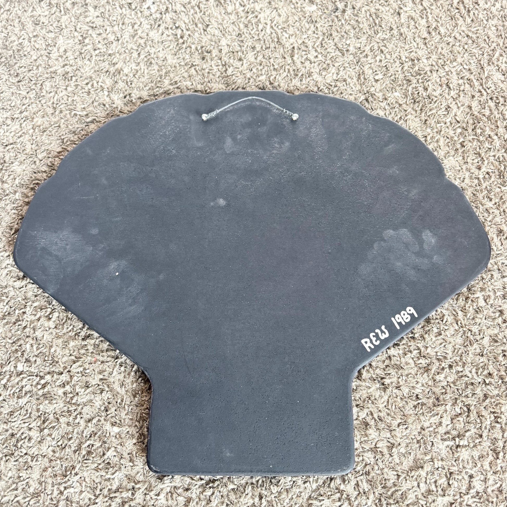 - The Postmodern Stained Glass Clam Shell Mirror features a fan-shaped silhouette with stained glass accents and a polished mirrored center.