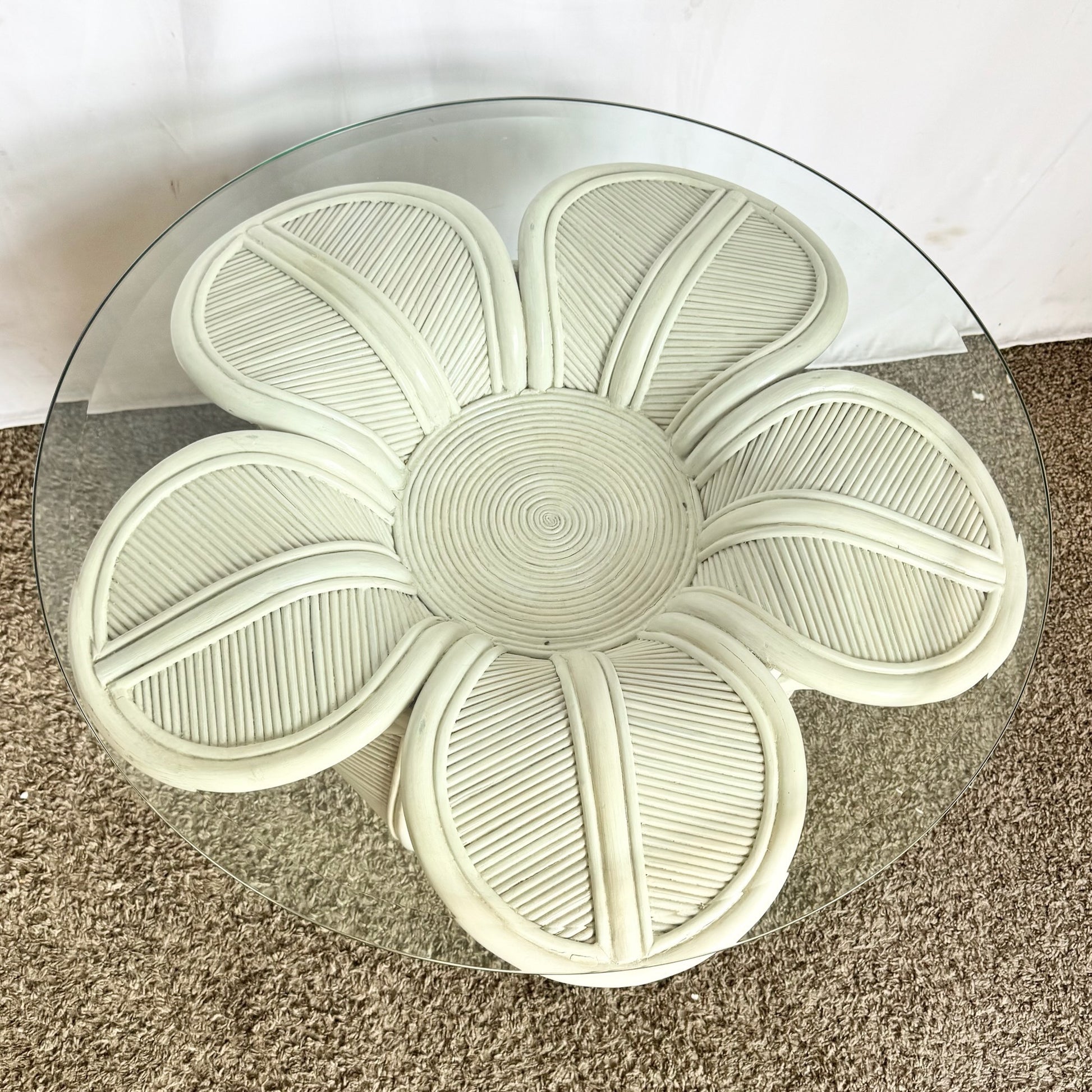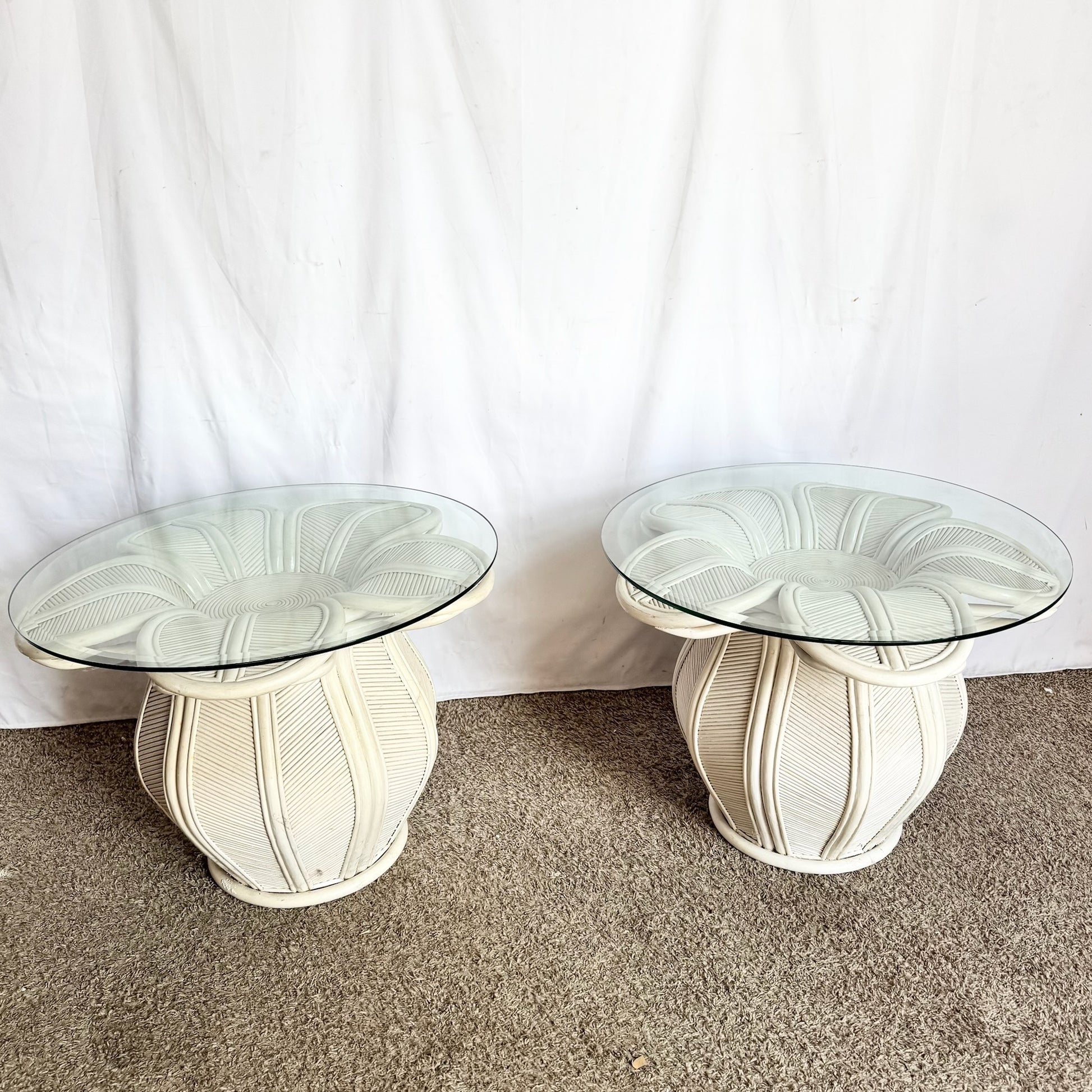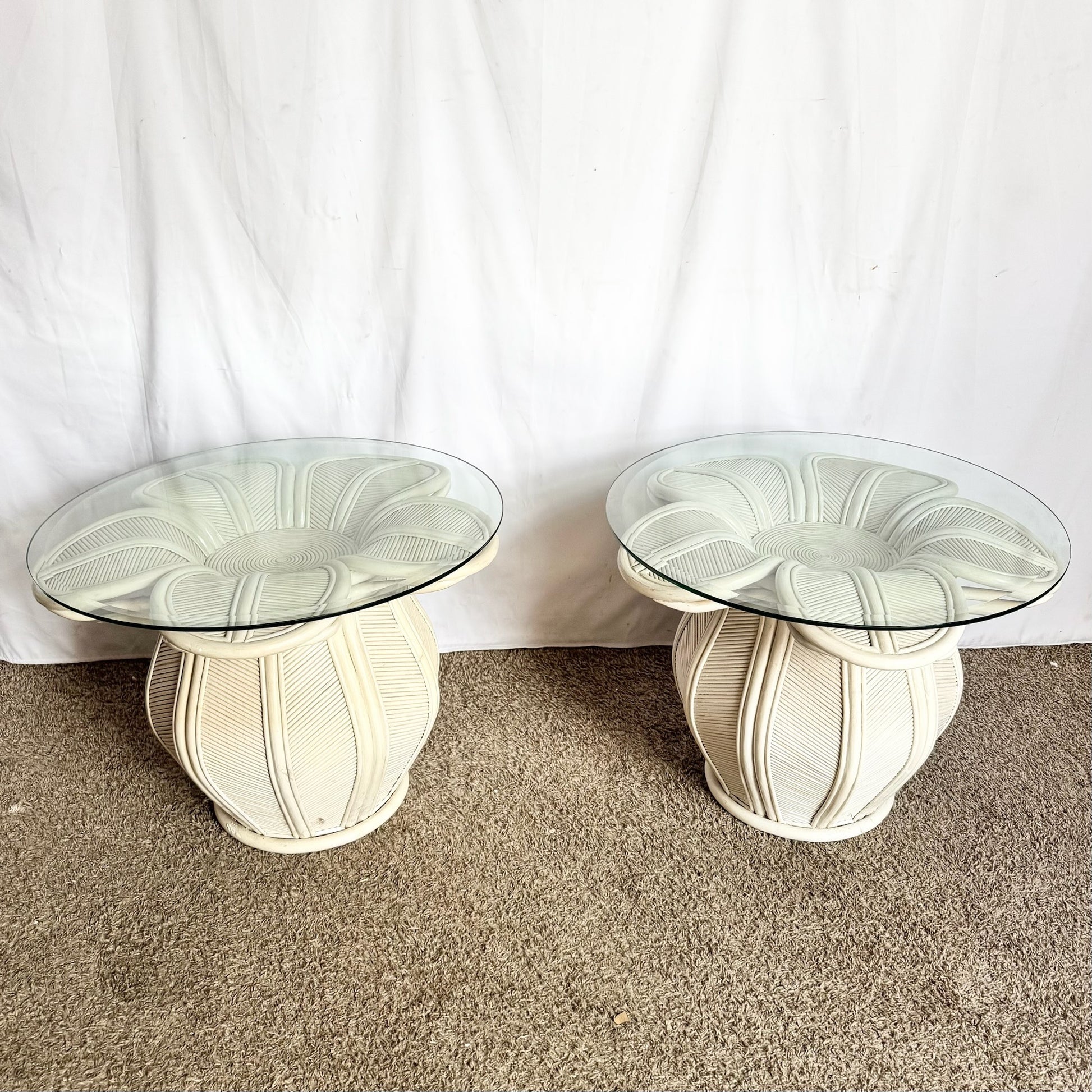 - The Pencil Reed Bell Flower Side Tables present a stacked “bell flower” silhouette rendered in fine pencil-reed rattan and capped with a clear glass surface.