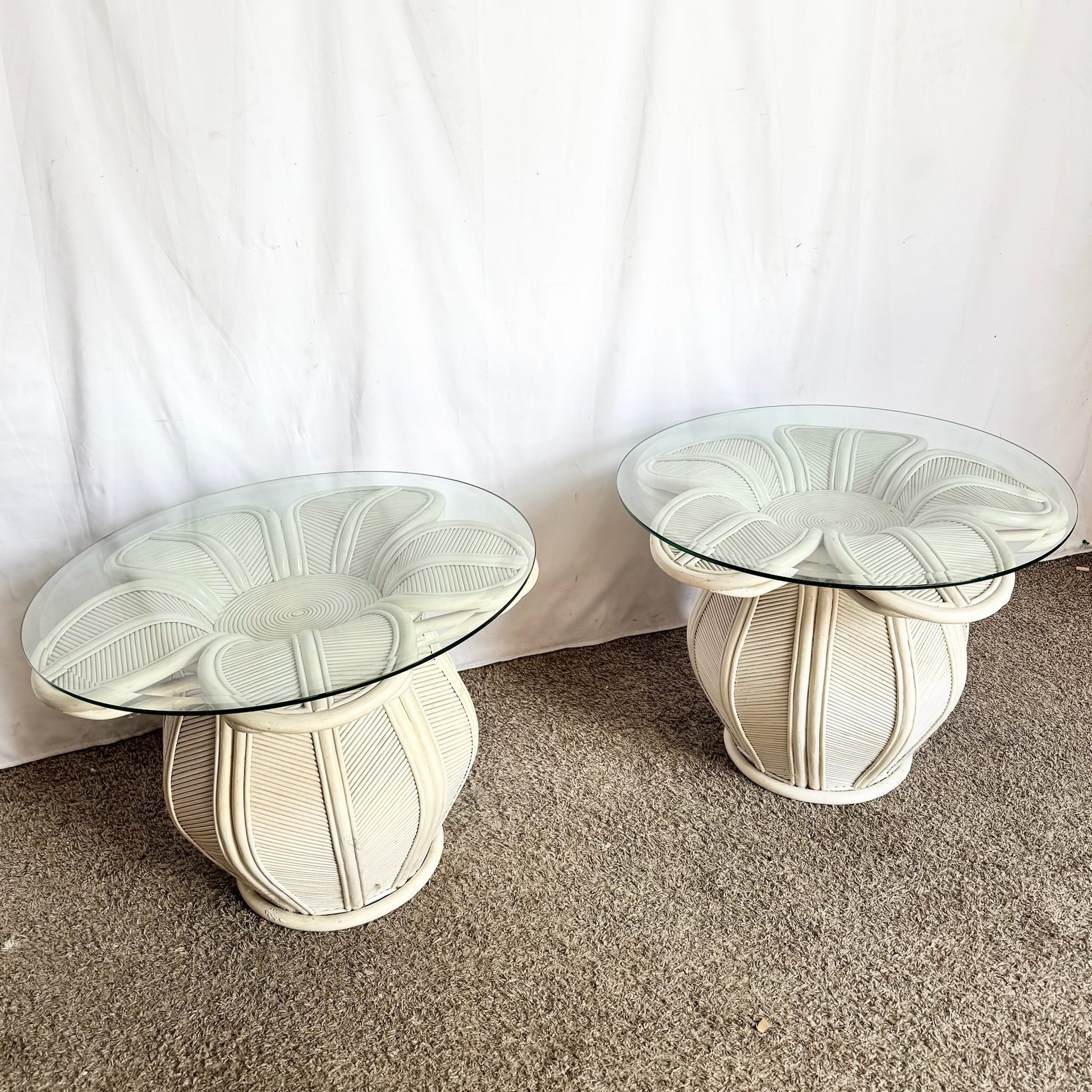 Vintage Boho Chic Pencil Reed Rattan Bell Flower Glass Top Side Tables - A Pair