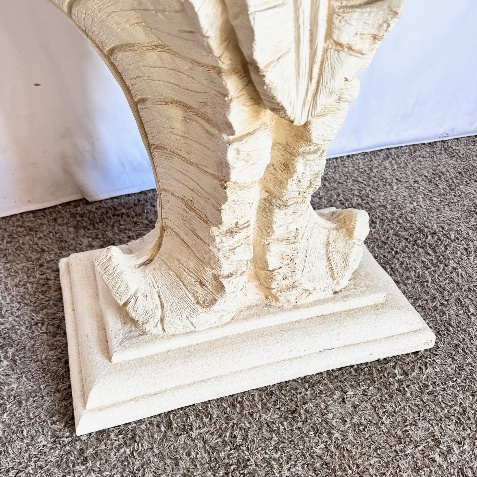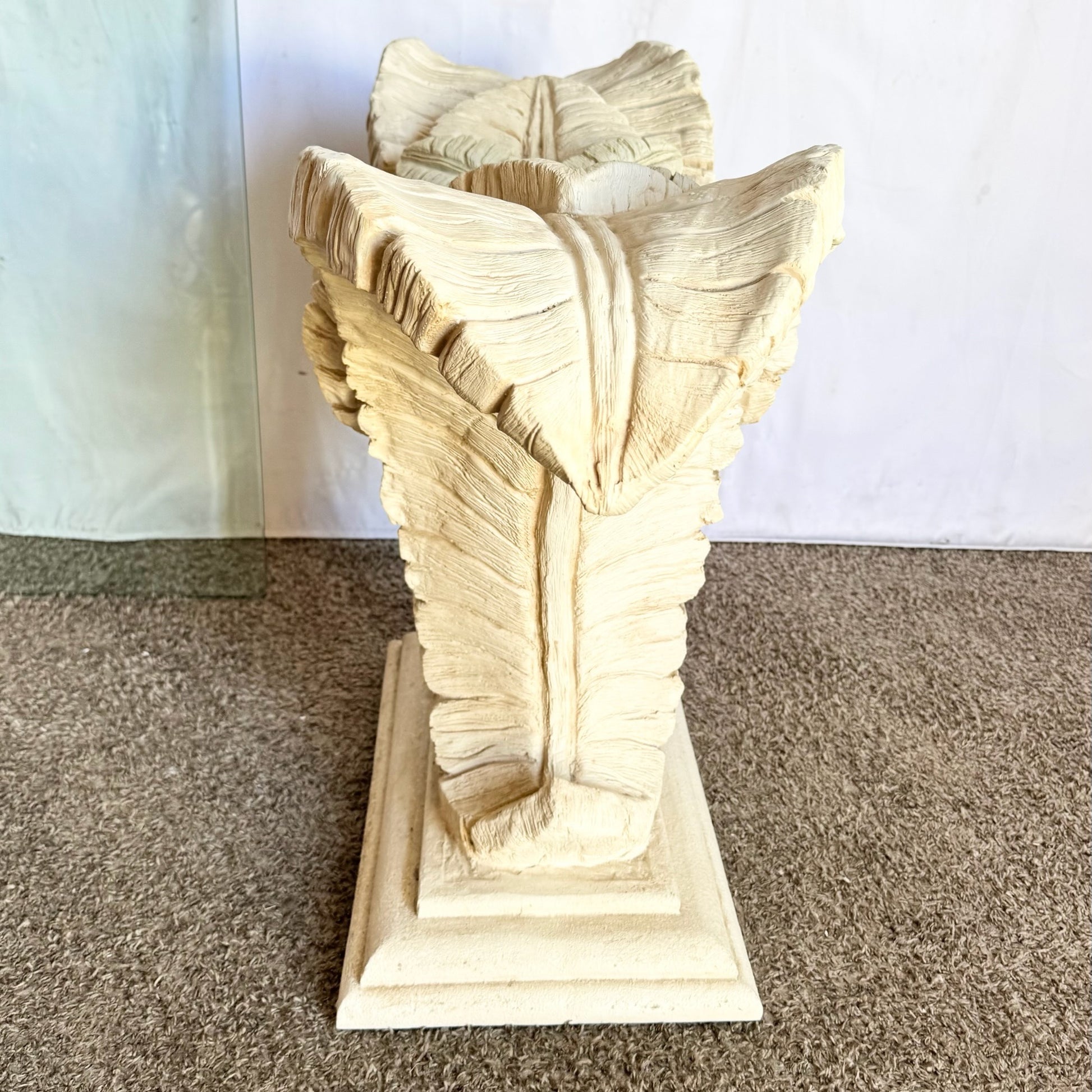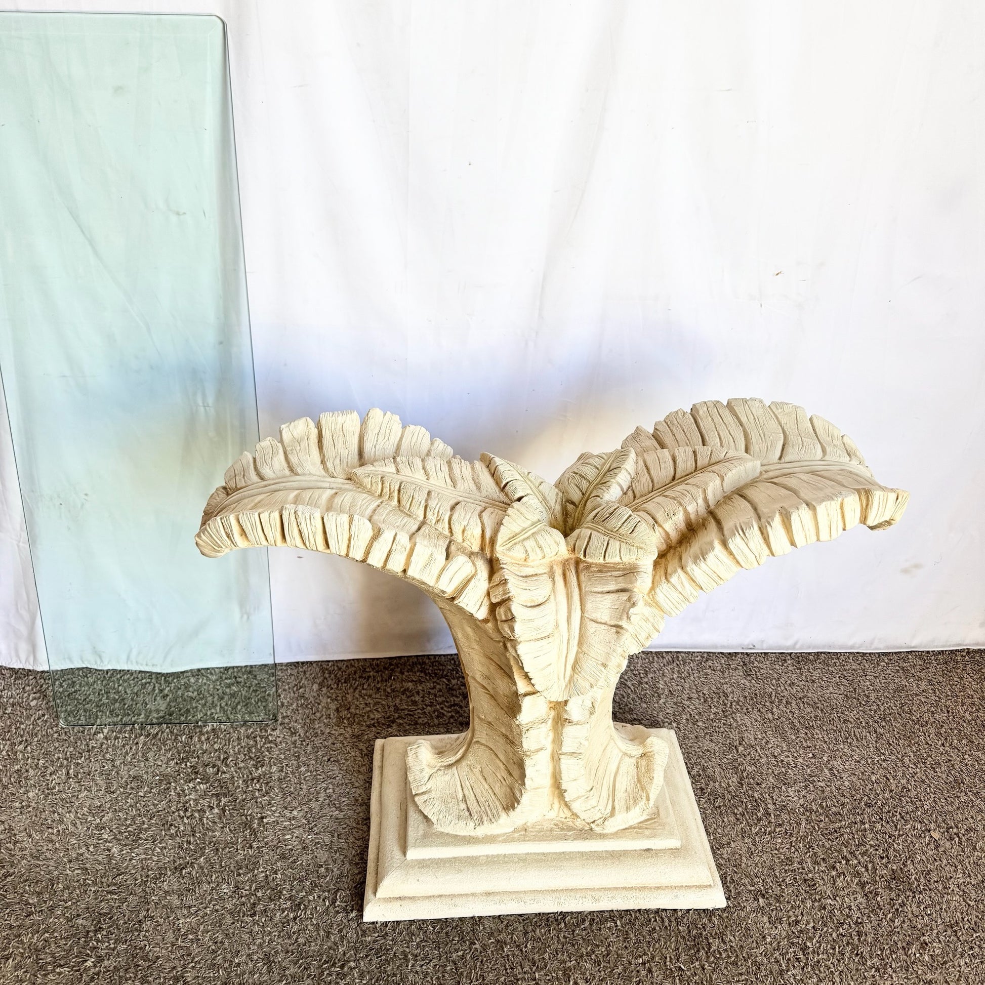 - The Boho Chic Banana Leaf Console Table features a resin base molded in bold banana-leaf motifs and a clear glass top that highlights its botanical-inspired sculptural silhouette.