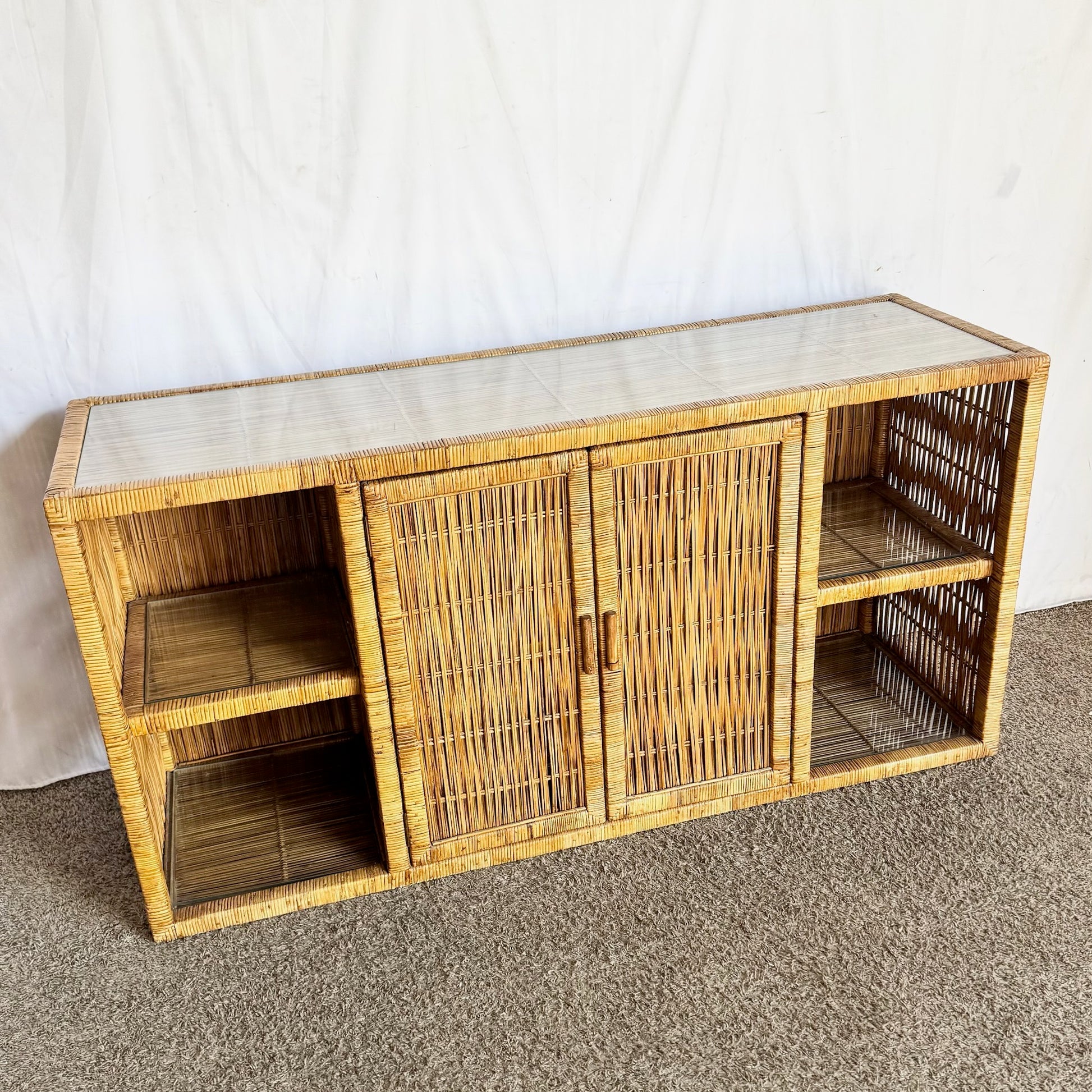 - The Vintage Boho Chic Wicker Credenza features finely woven wicker construction with a smooth inlaid glass top, offering a harmony of handcrafted texture and refined surface.