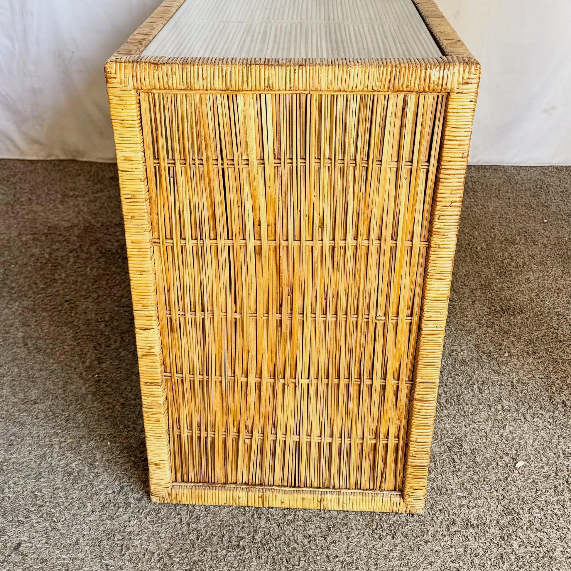 Vintage Boho Chic Wicker Credenza With Inlaid Glass