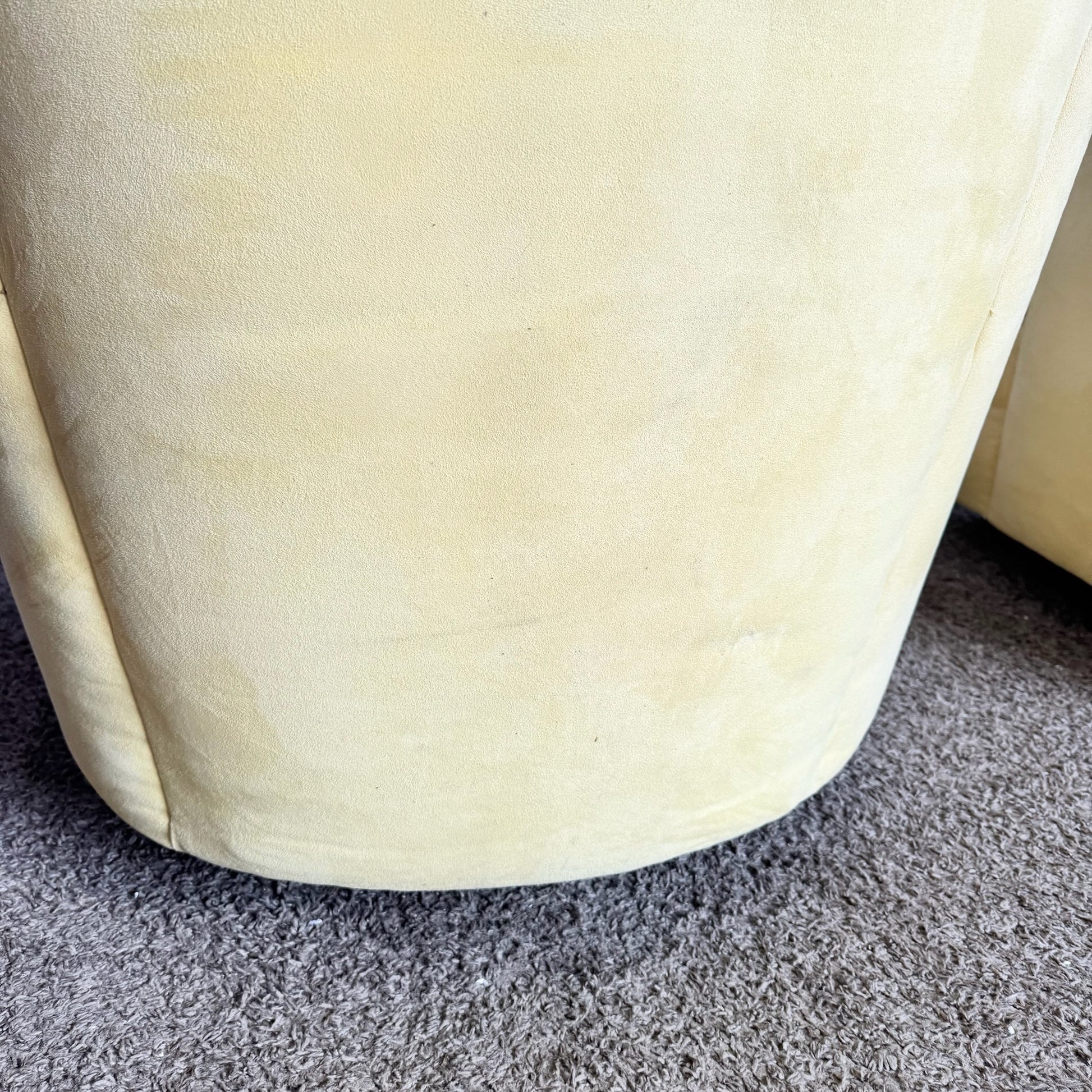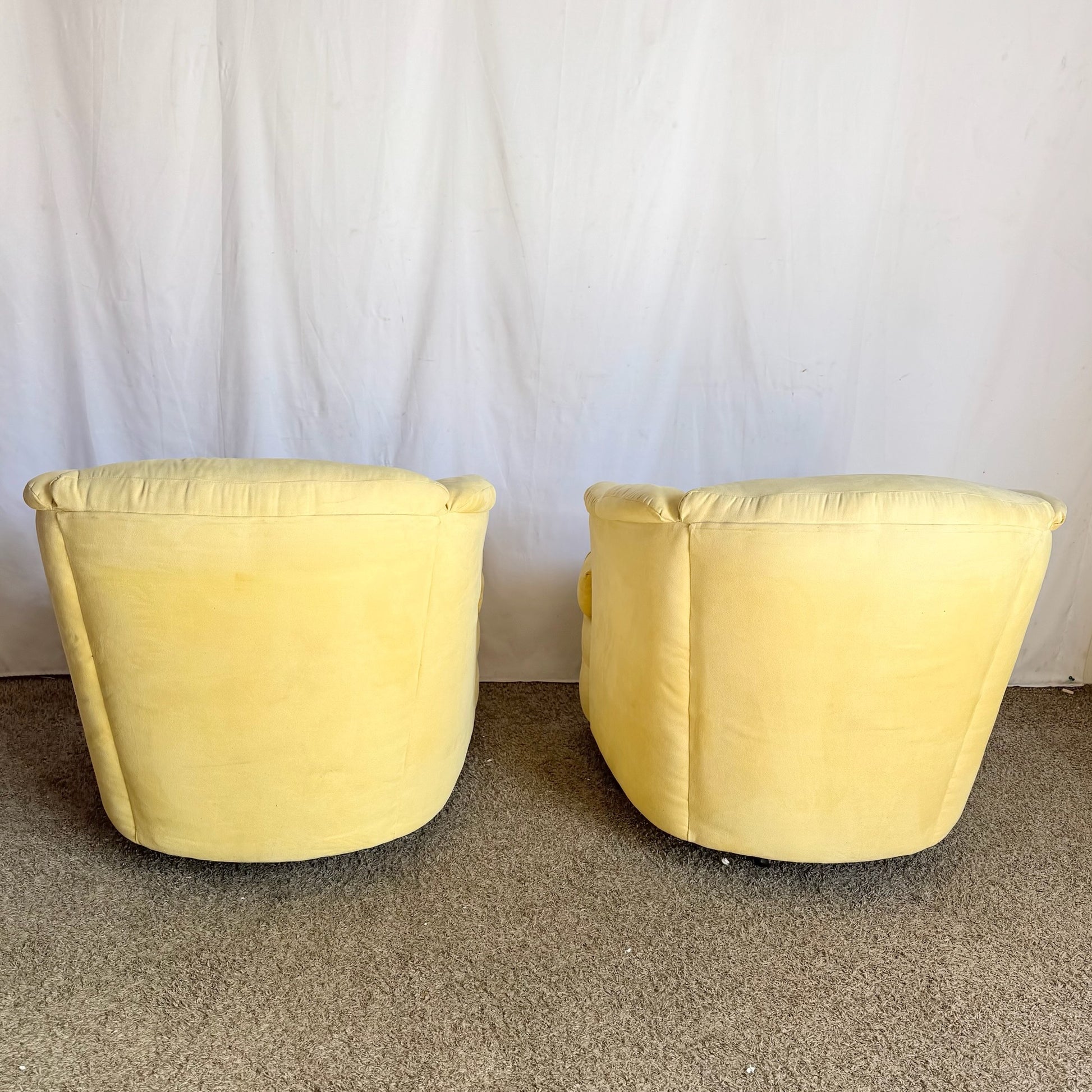- The Postmodern Yellow Fabric Swivel Chairs showcase gently flared backs and full-turn bases for dynamic seating with presence.