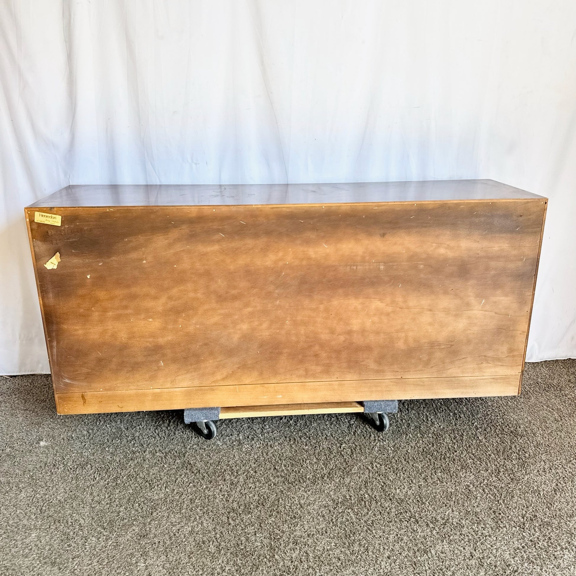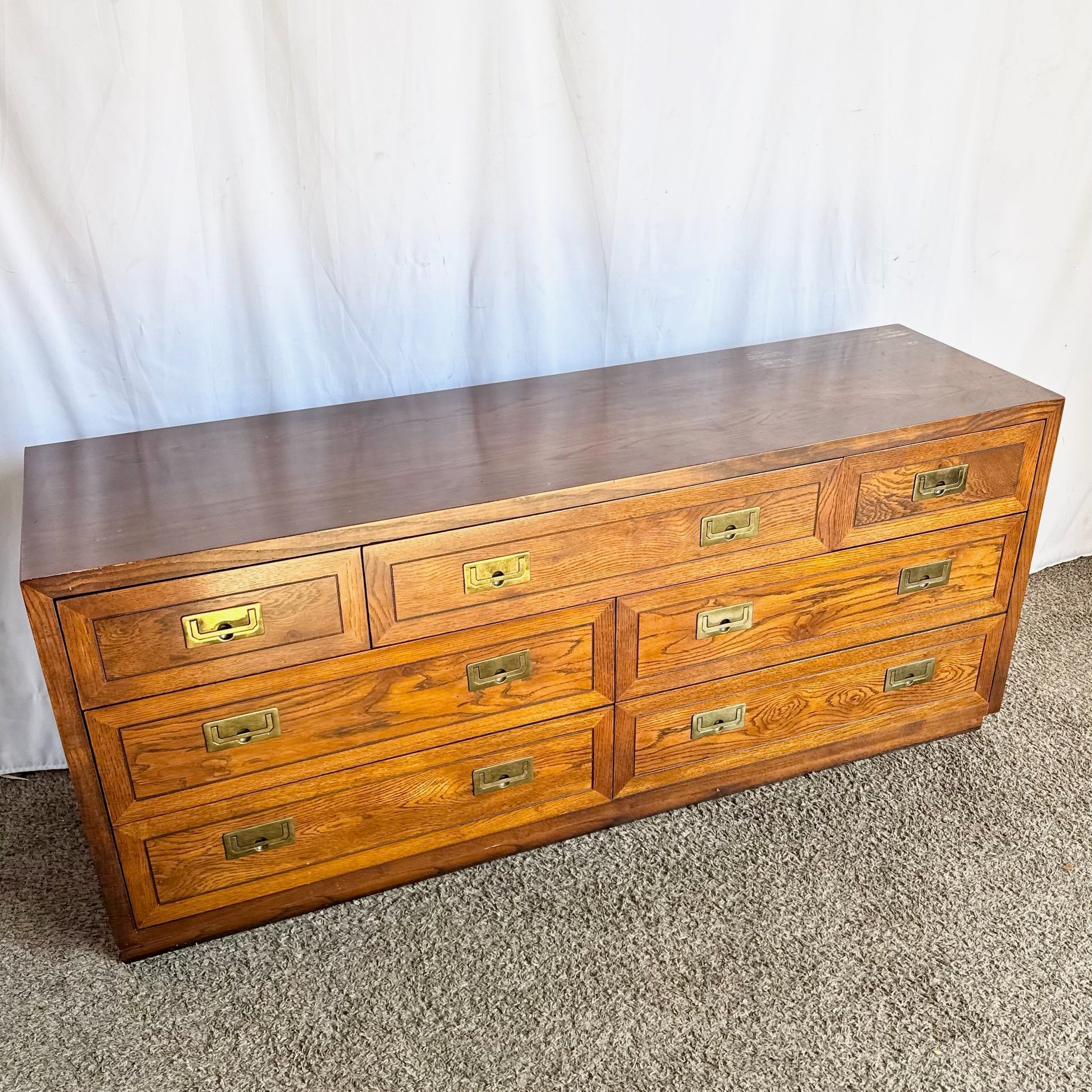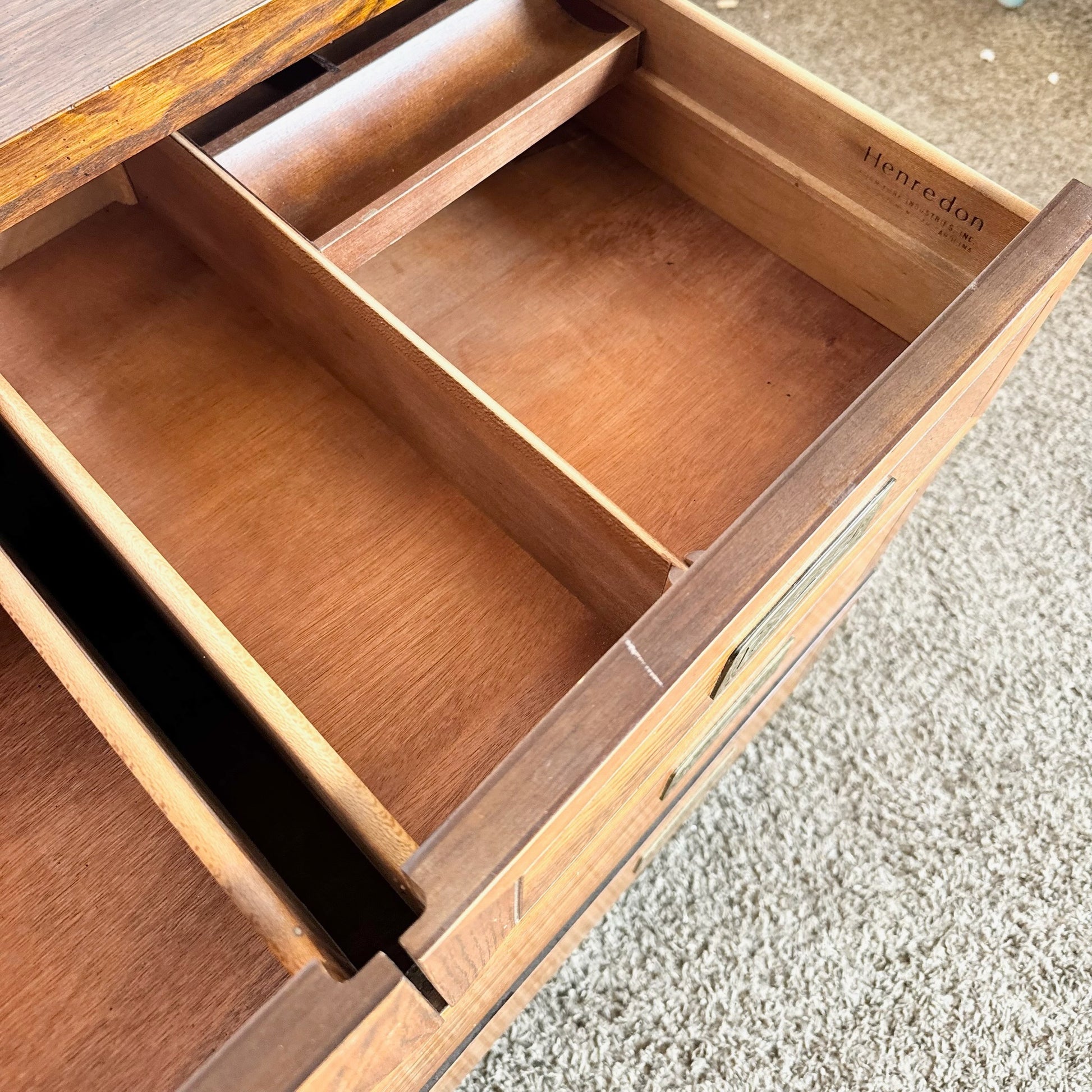 - The Henredon Scene One Campaign Dresser features six wide drawers with mitred framed fronts, dovetail joinery and brass-trimmed hardware—a hallmark of fine craftsmanship.