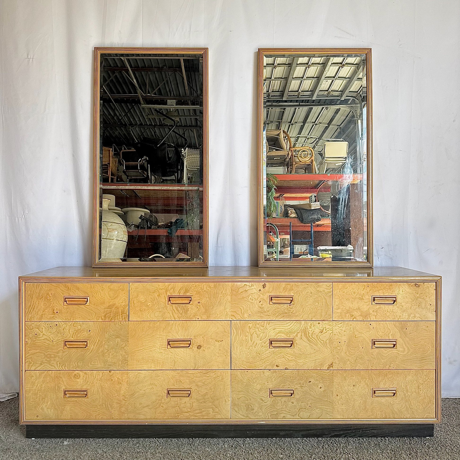 Vintage “Scene Two” Blonde Burlwood Dresser With Mirrors by Henredon